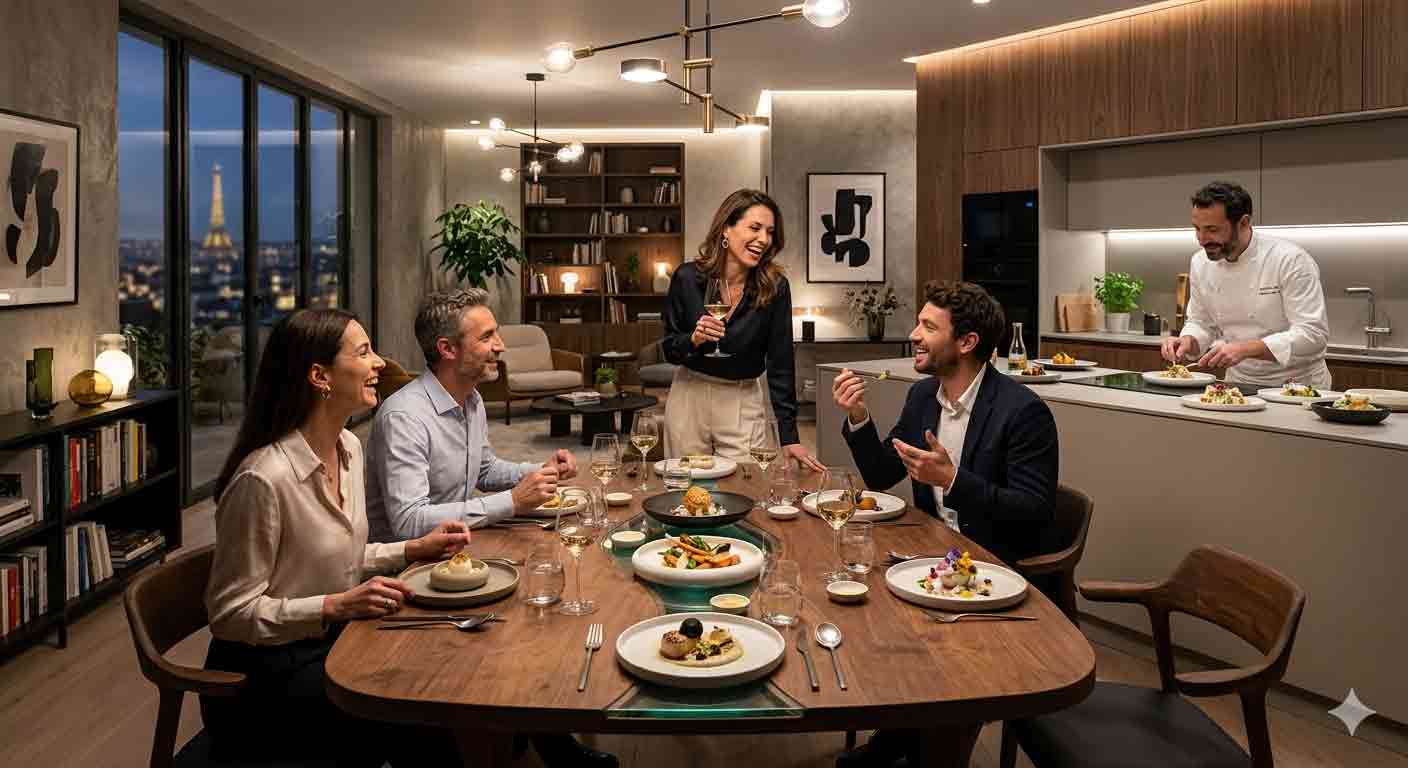 | Service à domicile | Repas préparés et livrés ou pris en main sur place pour une ambiance conviviale et intime. | Soirée entre amis avec plats signature et présentation soignée. |